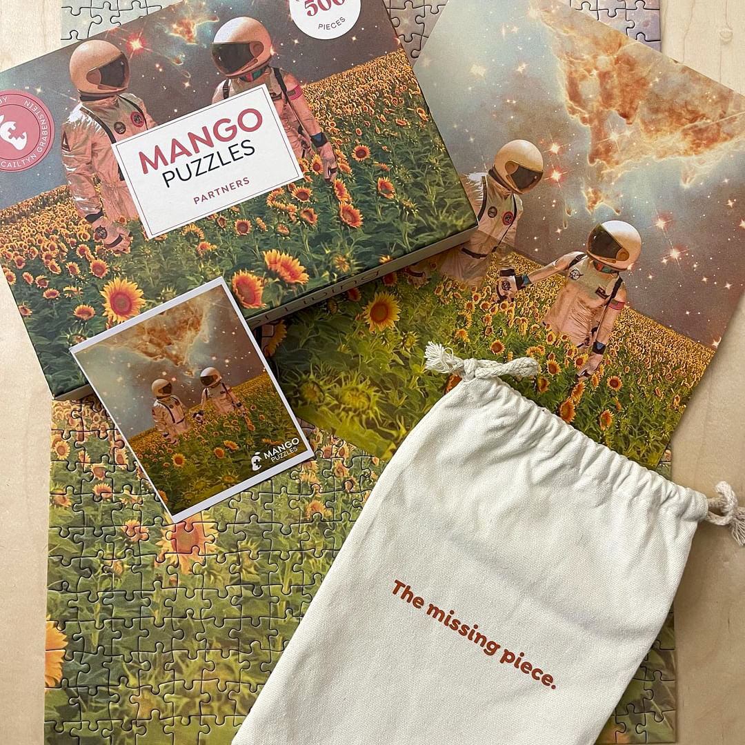 Premium jigsaw puzzle for adults. Featuring 500 pieces of thick, recycled blue cardboard in a reusable cotton bag. Full size poster and NO puzzle dust.